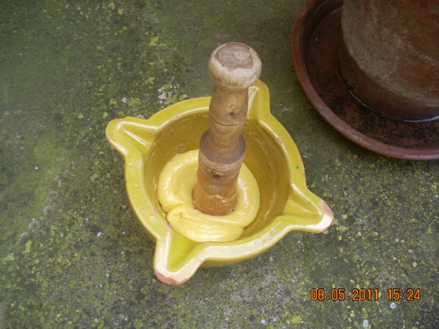 Segons he sentit a dir, -era un clàssic fa anys- l'autèntic all-i-oli era només això, all i oli: s'esclafaven ben esclafats els alls i, quan feien com una pasta, s'hi tirava oli que s'anàs prenent, fins a tenir-ne prou. Si he de dir la veritat, mai ho he vist fer ni n'he menjat, d'aquesta casta. També es feia all-i-oli a partir de patata: s'esclafava una patata petita bullida i, en ser ben fina, començaven a tirar-hi oli, també que se prengués. D'aquest darrer sí que n'he vist fer: a ca sa dida a vegades el feien així, i estalviaven 1 ou de les seves gallines, i el podien vendre: Eren temps de penúries econòmiques!!! |