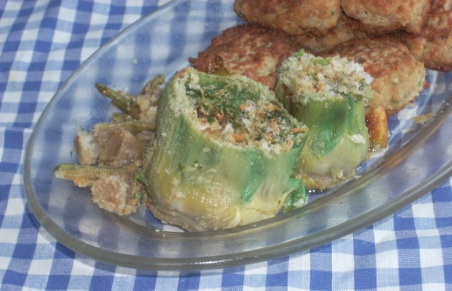 Supòs que se deuen dir a la mallorquina, però jo els record d'allà, encara en temps de la cuina econòmica: (La cuina econòmica no vol dir cuina barata de continguts, sinó un tipus de cuina de llenya, amb forn incorporat, que tenia molt poca gent; a Palma perquè ja hi havia gas, però els senyoravis sempre varen anar retardats amb les modernors, i a Algaida perquè tot eren foganyes, fogonets de carbó -pocs, i les cuines econòmiques, -un luxe, que podria comptar amb els dits de les mans i identificar on eren) Agafeu quantes carxofes vulgueu fer; tallau-les per la part de dalt, a fi d'igualar-les. Talleu els troncs, perquè s'aguantin dretes dins la palangana del forn o la greixonera. Palau-les, traient les fulles més velles i verdes. Col·locau-les dins la palangana on les hàgiu d'enfornar. Ompliu-les per damunt, mirant que es fiqui dins les fulles, amb una picada d'ametlles, all, juevert i pa ratllat, que faci com una pasteta. Afegiu-hi sal, pebre bo i oli abundant. Acabau de posar-hi, per damunt, pa ratllat -pa sec esmicolat amb un rallador. Enfornau-les, fins que siguin cuites, una estona els podem tapar, perquè agafin força, i desprès destapades, perquè agafin color.