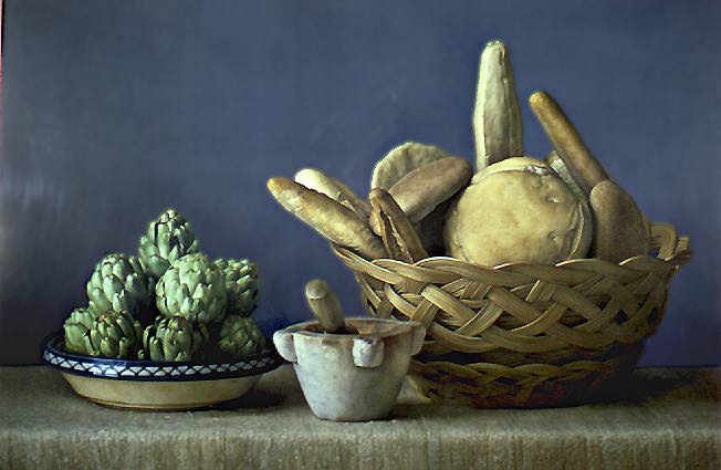 (Pan y alcachofas: Claudio Bravo, Chile, 1936) Claudio Bravo ha mort al Marroc el Juny de 2011. La inclusió d'aquest bodegó serveix com homenatge al pintor mort.