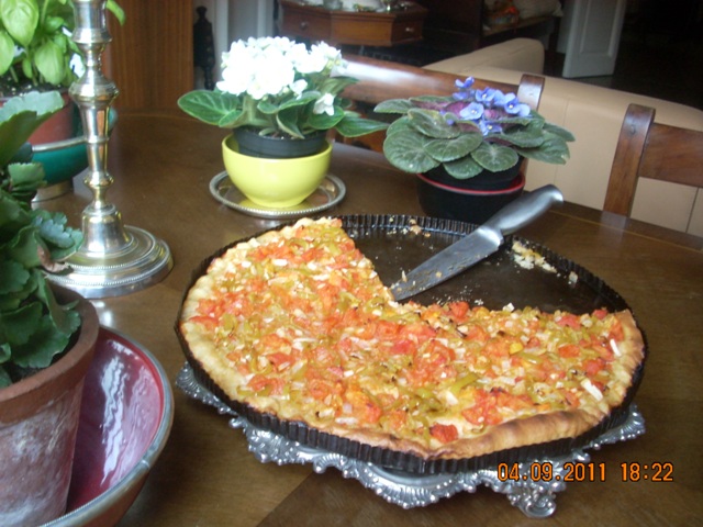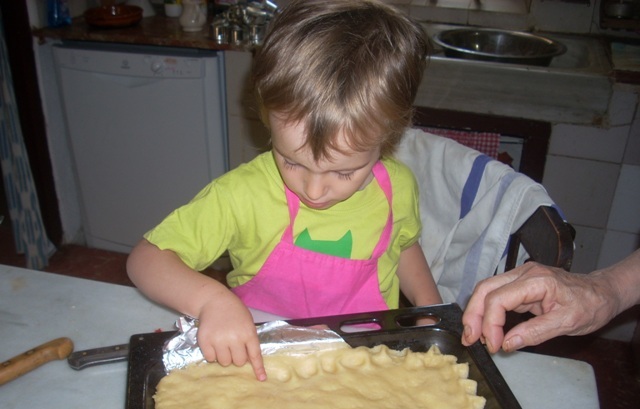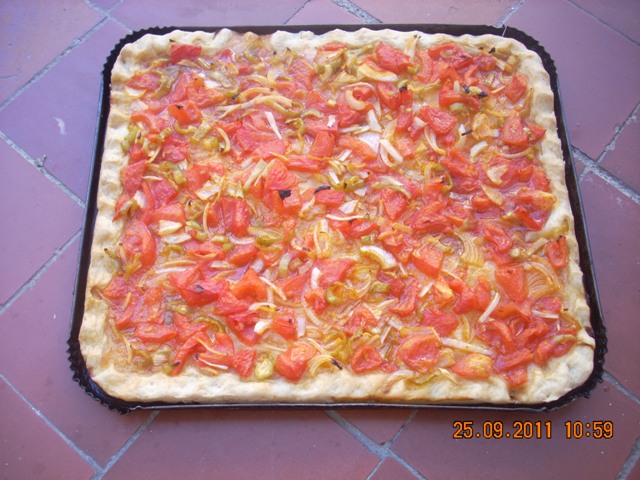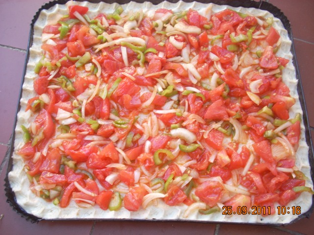 · Posau dins un ribell, o dins un bol, l'aigua, una mica teba, el saïm, la llevadura, que es comenci a desfer. · Anau afegint la farina, a poc a poc, remenant amb les mans. · S'anirà mesclant tot, primer fent una pasta grumosa i fluixa i, llavors, més fina i consistent. S'ha d'anar fent amb les mans, perquè és l’única manera de sebre si està bé. · Quan ja va agafant consistència, hi afegirem l'oli, com per rentar-nos les mans, i acabarem d'afegir la farina fins veure que la pasta està a punt. · S'ha de pastar, fènyer, bé, si volem que quedi bona. · La pasta està a punt quant és fina. llisa, consistent, però blana i modelable, i es desferra –es separa- de les mans. · Es pot sebre que està a punt, perquè les mans i el ribell, pràcticament queden nets. · Quan la pasta està, l'estenem a damunt una llauna d'anar al forn, ben igualeta per tot, (un mig cm. de gruix) i la deixam a un lloc una mica calent, perquè tovi. · Quan ha tovat, hi fem, per tot el voltant, una endinsada i un pessic, tant per adornar com perquè faci de paret per la verdura. · Un cop a punt la pasta, hi estenem la verdura, trempada amb oli, sal i pebre bord, ben repartida i escampada. · Ho enfornam a foc mitjà-alt, una mitja hora. · Ha de quedar la pasta de la vorera i d'abaix cruixent, torradeta, i la verdura cuita, però no cremada. |