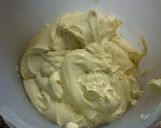 Posam el vermell d'ou dins el morter. Amb la maça començam a remenar sempre amb la mateixa direcció: no puc dir en el sentit de les agulles del rellotge, perquè, amb dos esquerrans a la família, -tres, segons es miri- no sé en quin sentit deveu girar. Anam tirant l'oli a raigs prims, que es vagi mesclant bé i fent una pasta fina. Si ens queda massa espessa, -segons per què la volem, ens convé clareta- hi podem afegir, al final, blanc d'ou batut, i s'aclarirà.